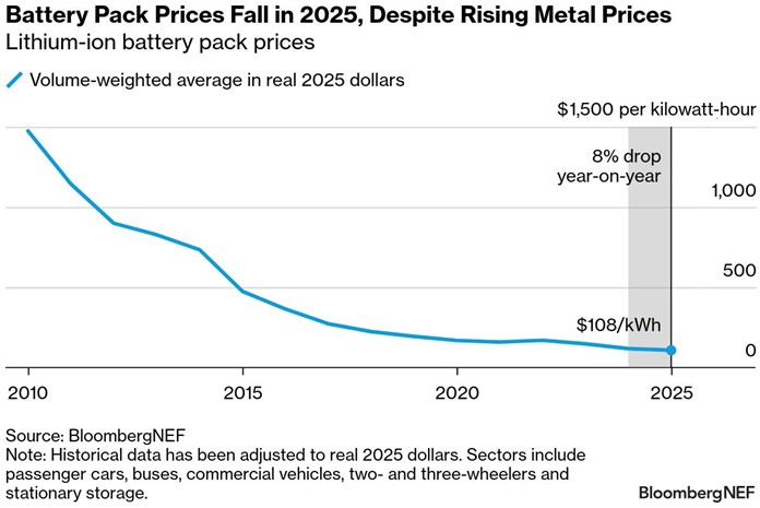 Despite increasing metal costs, battery prices continue to fall and now stand at an average US$108 (NZ$186) per Kilowatt-hour, according to BloombergNEF. The biggest price drop (45%) was seen in battery packs for stationary storage, with their price now standing at an average US$70/kWh (NZ$121/kWh). The price of battery electric vehicle packs now stands at an average US$99/kWh (NZ$171/kWh).