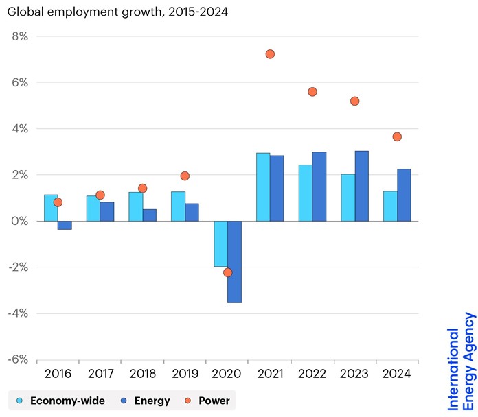 The World Energy Employment report for 2025, just published by the IEA, tells us employment in the energy sector is increasing twice as fast as the global economy as a whole. There were 76 million people employed in the energy sector in 2024 and the sector accounts for 2.4% of all jobs created over the last five years. The power sector accounted for three quarters of recent growth and is now the largest energy employment sector, surpassing fuel supply.