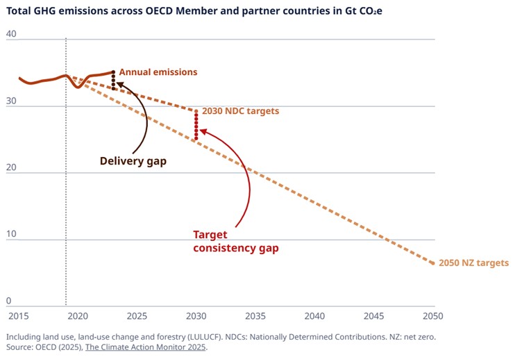 The recently published OECD Climate Action Monitor reports poor progress on reducing emissions across its 52 members. Climate action expanded only 1% in 2024, continuing the slowdown observed since 2021. Only 30 OECD countries (representing less than 18% of global emissions) have legally binding net-zero targets. To constrain warming to 1.5C above pre-industrial levels will require a 63% reduction of emissions from OECD countries by 2035.