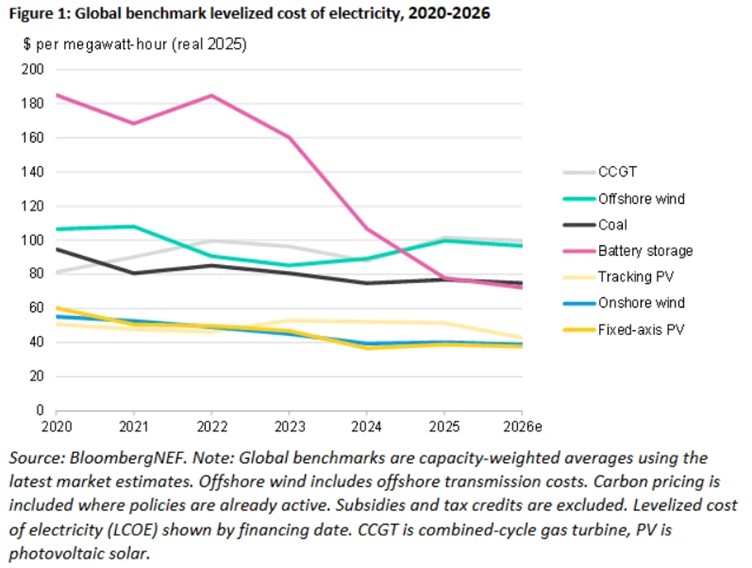 Another report from BloombergNEF tells us the cost of battery storage continues to fall, while other clean power technologies are experiencing price increases. The company’s Levelized (sic) Cost of Electricity 2026 report reveals a 27% drop in battery costs, with its benchmark four-hour project cost now sitting at $78/MWh. Costs for solar and wind nudged up in the year, with increases attributed to supply chain constraints.
