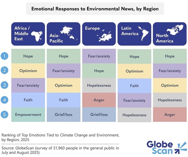 GlobeScan has just published a report on how people’s reactions to climate change issues differ around the world. The findings reveal quite a difference by region with the Global South tending to be more optimistic. There is a general preference for systemic change rather than personal sacrifices and we also see evidence of growing climate fatigue. Climate change came in 7th on a list of global problems, which was headed by concerns over war, cancer, corruption and poverty. New Zealand was not one of the 33 countries surveyed.