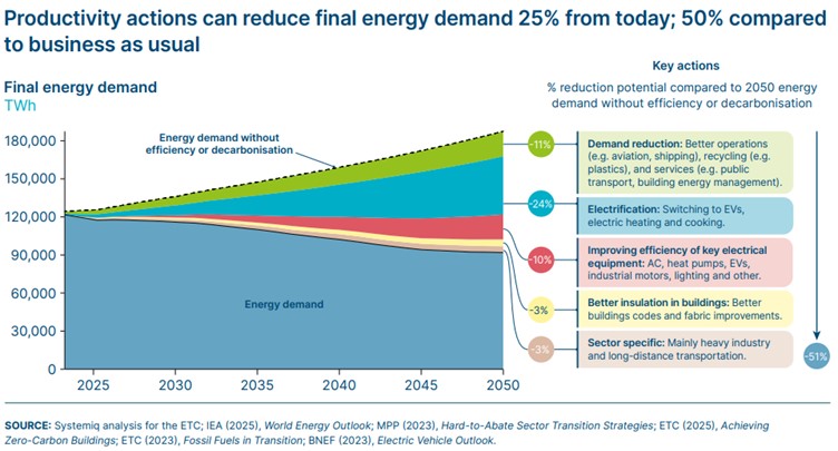 We can double the size of the world’s economy and do it with 25% less energy. That’s the claim of the Energy Transitions Commission which projects by 2050 we’ll be seeing 150% more air travel than now, 70% more passenger road travel, heating demand up 25%, cooling demand up 150%, 100% more aluminium production, 25% more steel production and 70% more plastic production and all this can be achieved with using 25% less energy through productivity improvements. Electrification is seen as offering the most potential for gains.